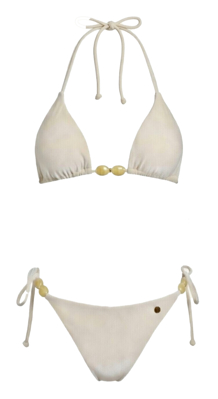 Bikini de triángulo en terciopelo italiano con detalles de resina reciclada. 72% microfibra, 28% elastano.