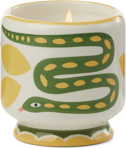 Vela aromática en recipiente de cerámica (227g) pintado a mano con iconos de comida y presentada en una caja deslizante reutilizable y apta para uso alimentario.