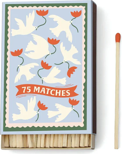 Caja con 75 cerillas de seguridad de 9,6 cm, con punta naranja y diseño mediterráneo inspirado en la colección A Dopo!. Un accesorio decorativo y funcional que complementa el estilo elegante y relajado de las velas de la misma línea.