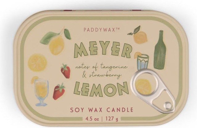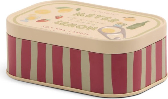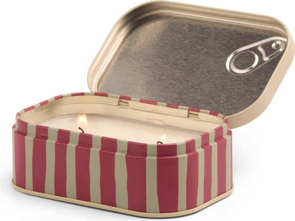 Vela decorativa con diseño inspirado en latas de sardinas e ilustraciones hechas a mano.