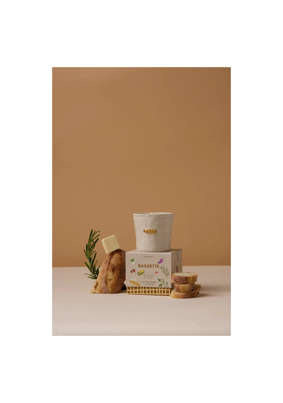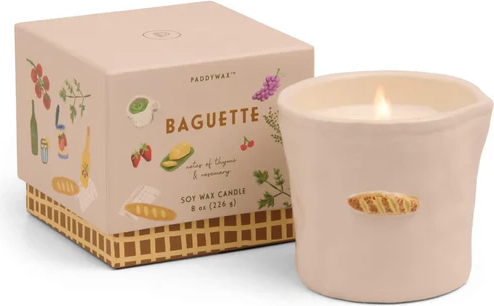 Vela aromática en recipiente de cerámica (227g) pintado a mano con iconos de comida y presentada en una caja deslizante reutilizable y apta para uso alimentario.