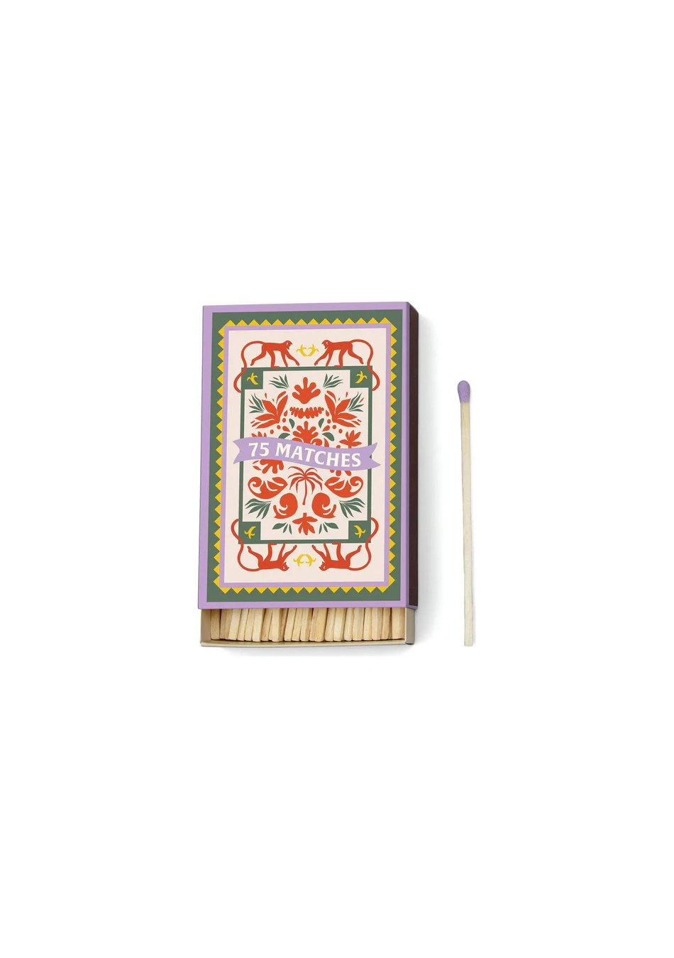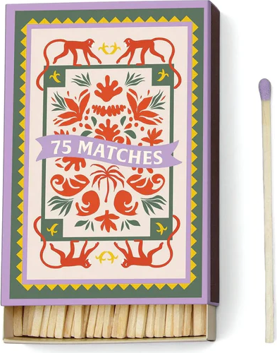 Caja con 75 cerillas de seguridad de 9,6 cm, con punta naranja y diseño mediterráneo inspirado en la colección A Dopo!. Un accesorio decorativo y funcional que complementa el estilo elegante y relajado de las velas de la misma línea.