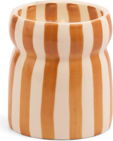 Vela Cabana de 184 g, pintada a mano y con forma de pinza. Una vez consumida, su recipiente de cerámica apto para alimentos puede reutilizarse. La fragancia Atardecer en Siena ofrece un aroma cálido y costero con notas de salida de bergamota, limón y sal marina; un corazón de flores de algodón, nenúfar y palo de rosa; y un fondo de ámbar, cachemir y almizcle.
