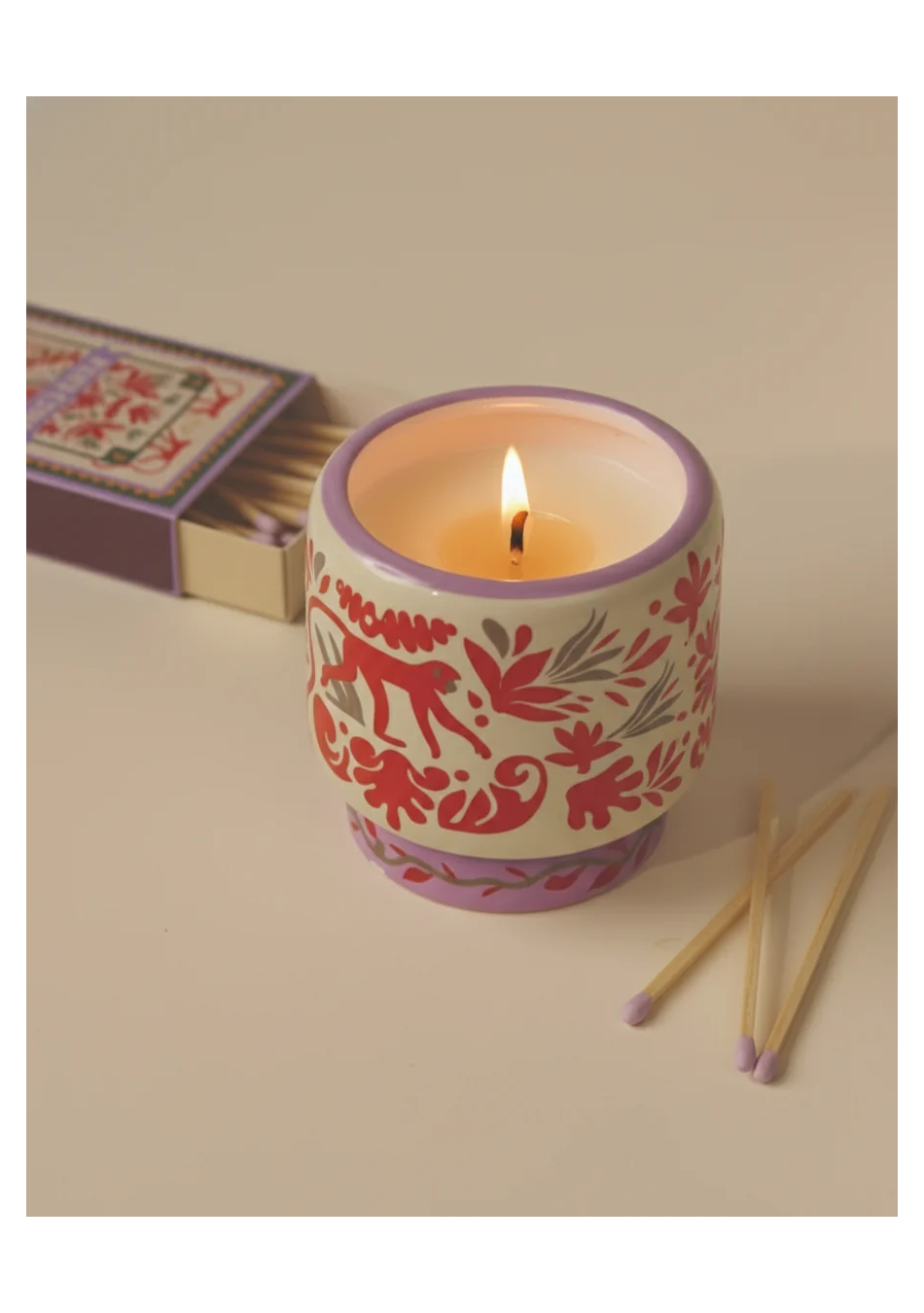 Caja con 75 cerillas de seguridad de 9,6 cm, con punta naranja y diseño mediterráneo inspirado en la colección A Dopo!. Un accesorio decorativo y funcional que complementa el estilo elegante y relajado de las velas de la misma línea.