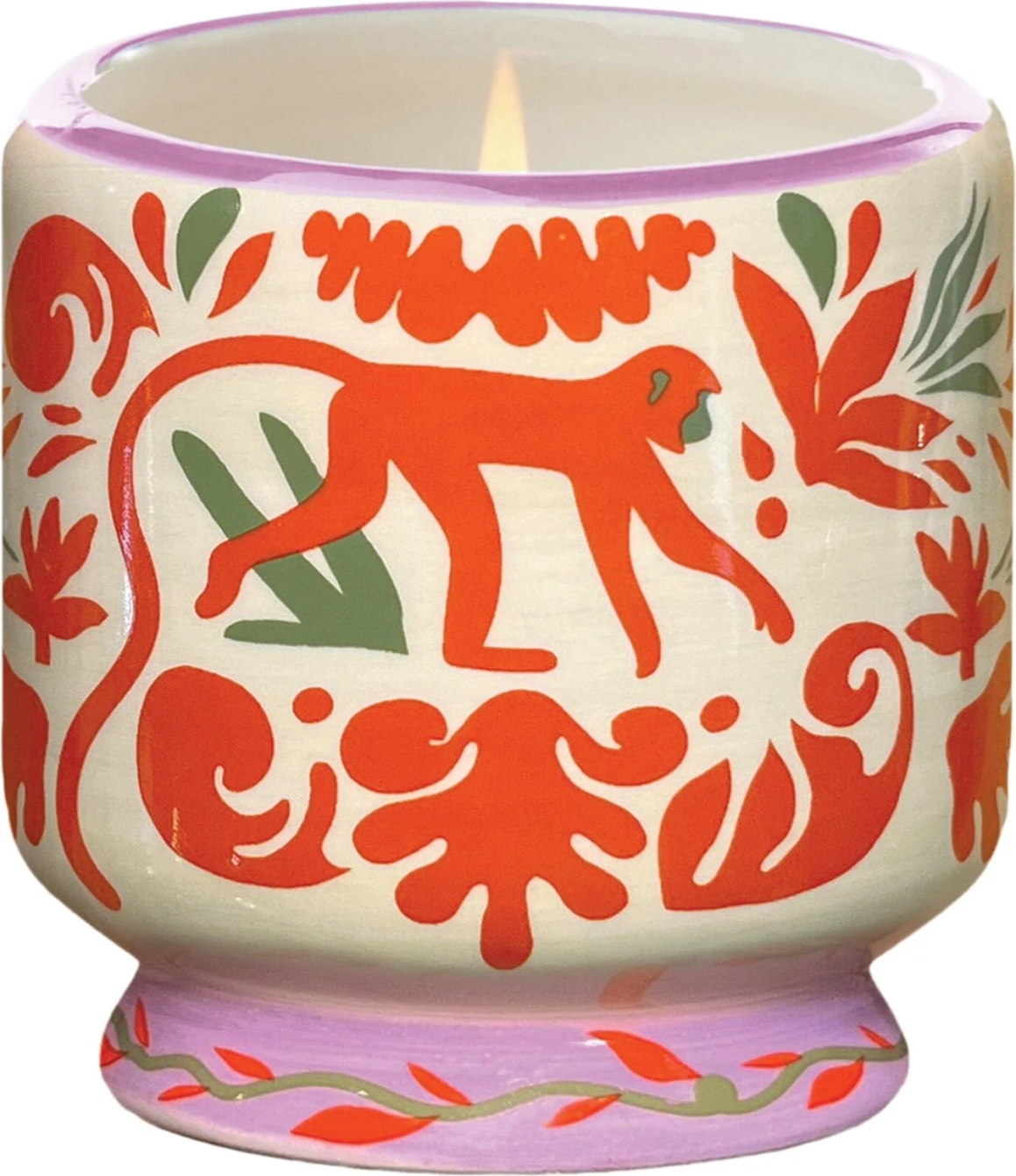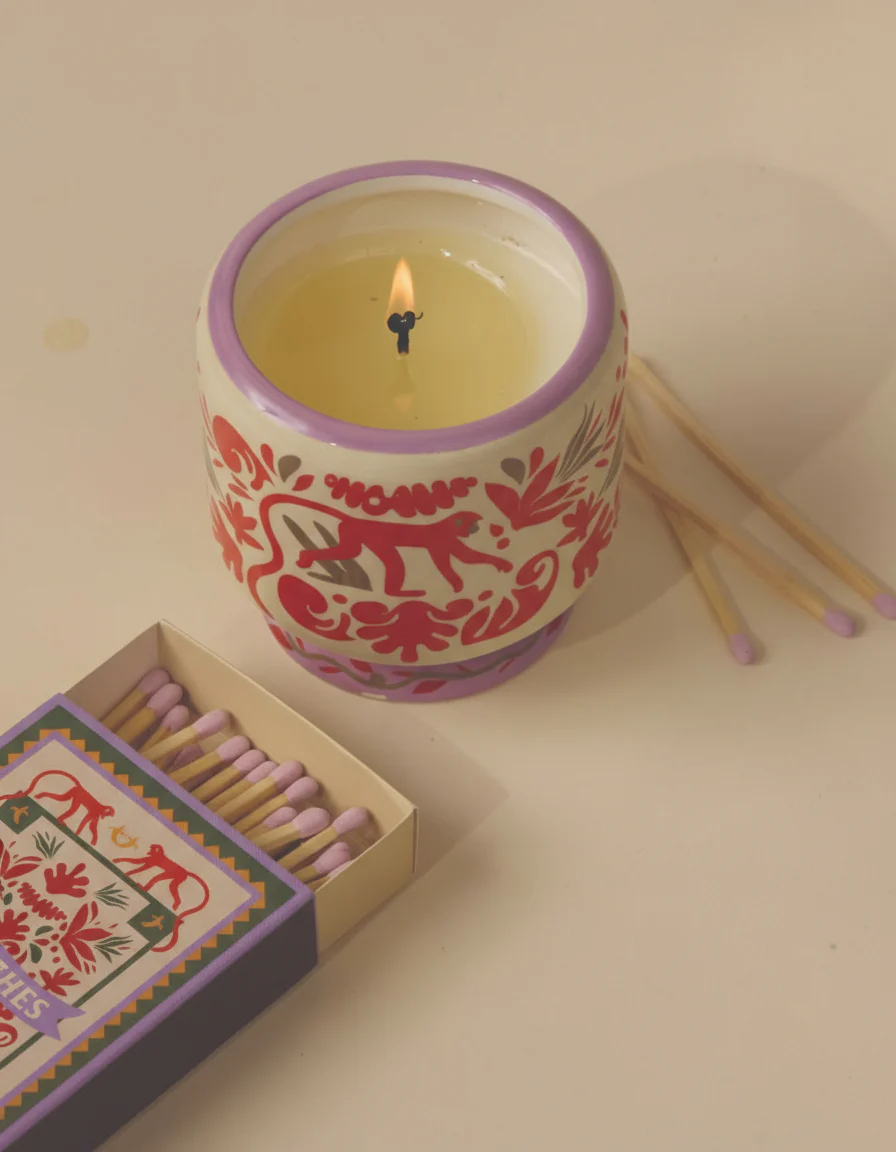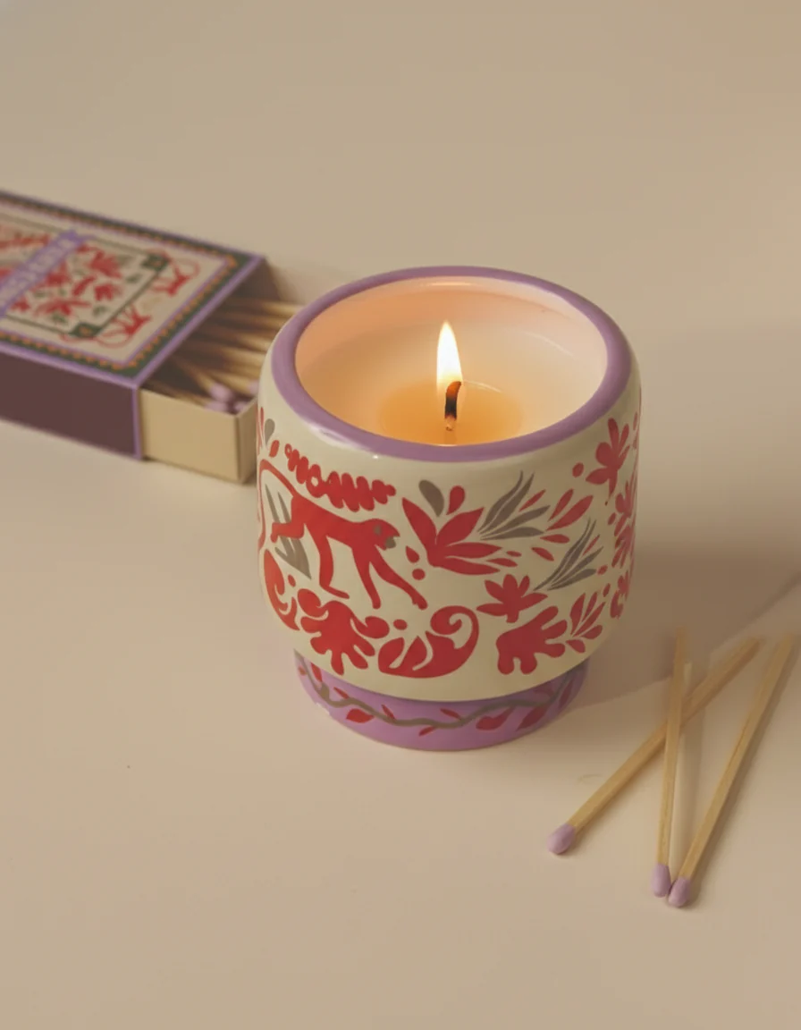 Vela aromática en recipiente de cerámica (227g) pintado a mano con iconos de comida y presentada en una caja deslizante reutilizable y apta para uso alimentario.